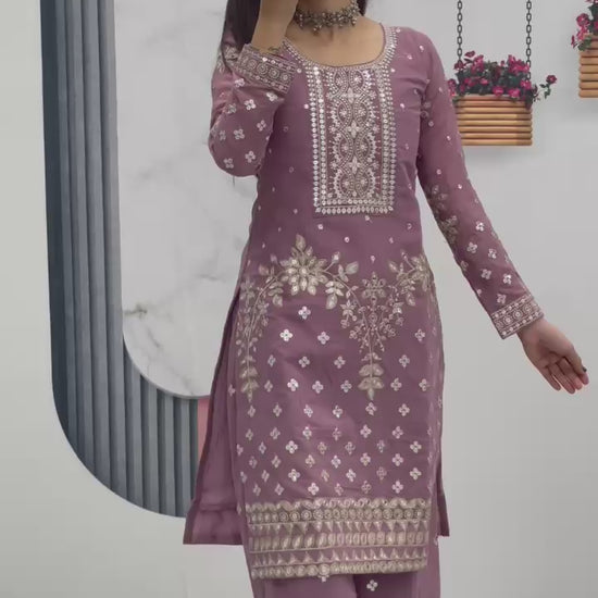 Add timeless elegance to your festive wardrobe with this beautifully designed Fox Georgette Palazzo Set. Featuring heavy embroidery thread and sequence work on premium fabric, this fully stitched ready-to-wear outfit offers graceful drape, comfort, and rich detailing perfect for special occasions.
