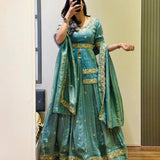 Step into luxury with this stunning Pure Tissue Simmer Lehenga Choli with Designer Jacket, crafted for women who love graceful shimmer with elegant hand detailing.