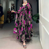 Step into effortless elegance with this beautifully designed Georgette Floral Printed Gown Set featuring delicate Peper Mirror Lace touch-up detailing. With its flowing 3.5-meter flair and full silk lining, this gown offers both comfort and graceful movement—perfect for festive occasions, parties, and special celebrations.