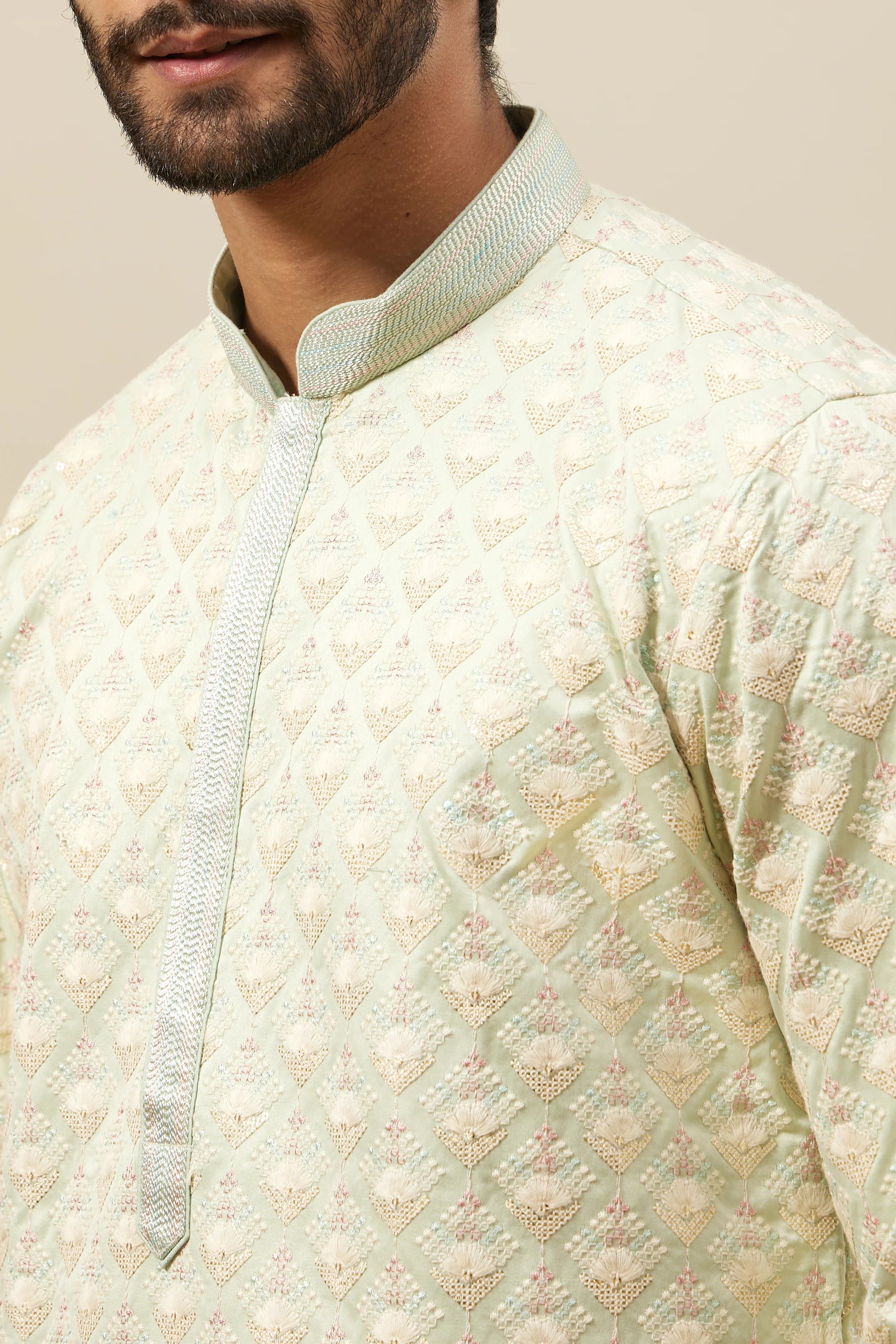 Indulge in bespoke luxury with this custom-tailored men's kurta churidar set, meticulously handcrafted from exquisite off-white Tusser silk. The natural texture and subtle sheen of premium silk are enhanced by refined embroidery detailing, creating an understated yet sophisticated aesthetic. Designed for weddings and formal occasions, this personalized ensemble combines artisanal excellence with superior comfort, offering the discerning gentleman an authentic expression of Indian elegance and refined taste.
