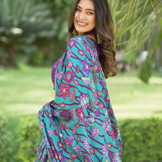 Elegant Tasar silk lehenga choli featuring traditional Kalamkari print enhanced with a refined foil work border. The stitched lehenga comes with canvas and can-can for graceful flair, secured with a drawstring, heavy tassels, and zip closure. Paired with an unstitched printed blouse and a matching Kalamkari dupatta finished with gotta patti lace and tassels—perfect for festive and ethnic occasions 🌷