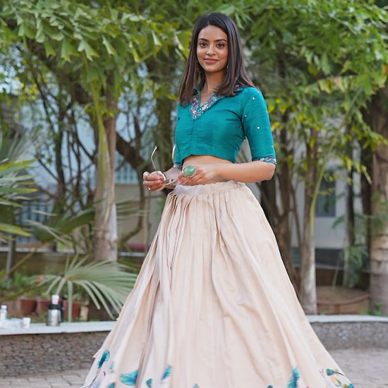 The lehenga features a beautiful floral print on premium Tussar Silk, enhanced with structured canvas stitching for a perfect fall. Paired with a stylish Banglory blouse featuring handwork and mirror detailing, this outfit is ideal for festivals, weddings, family functions, and cultural events.