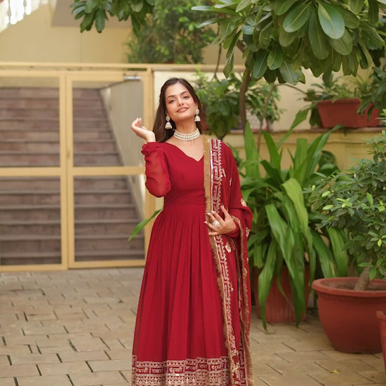 - Women’s Faux Blooming Embroidery Zari Sequins Work Gown with Dupatta