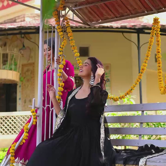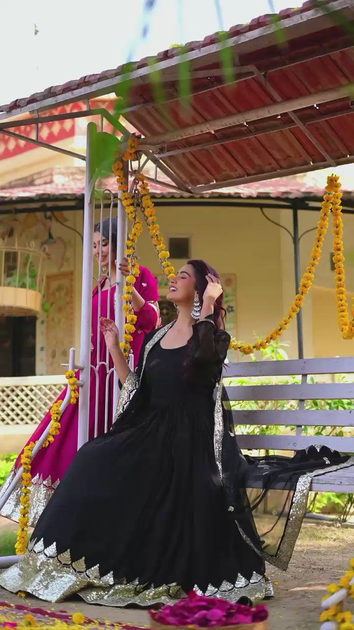 Upgrade your festive wardrobe with this beautiful Fox Georgette Designer Gown Set, crafted with heavy sequins embroidery work that gives the outfit a rich and glamorous appearance. This outfit is perfect for weddings, festive occasions, receptions, parties, and traditional celebrations.