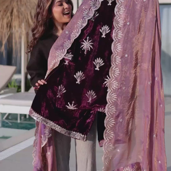 ✨ Elegant Ice Velvet Embroidered Kurta Palazzo Set with Designer Dupatta