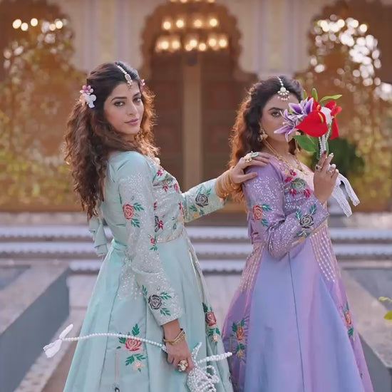 The lehenga is made from premium Vichitra fabric, designed with a 3.5-meter elegant flair that creates a graceful and flowy silhouette. The attached canvas patta provides better structure and volume, enhancing the overall appearance of the lehenga.