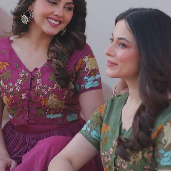 The sleeveless gown with a fancy round neck creates a sophisticated and flattering look, while the 3.5 meter wide flair offers a graceful flow for a royal silhouette. The gown is stitched with canvas patta, ensuring a structured flare and premium finishing.