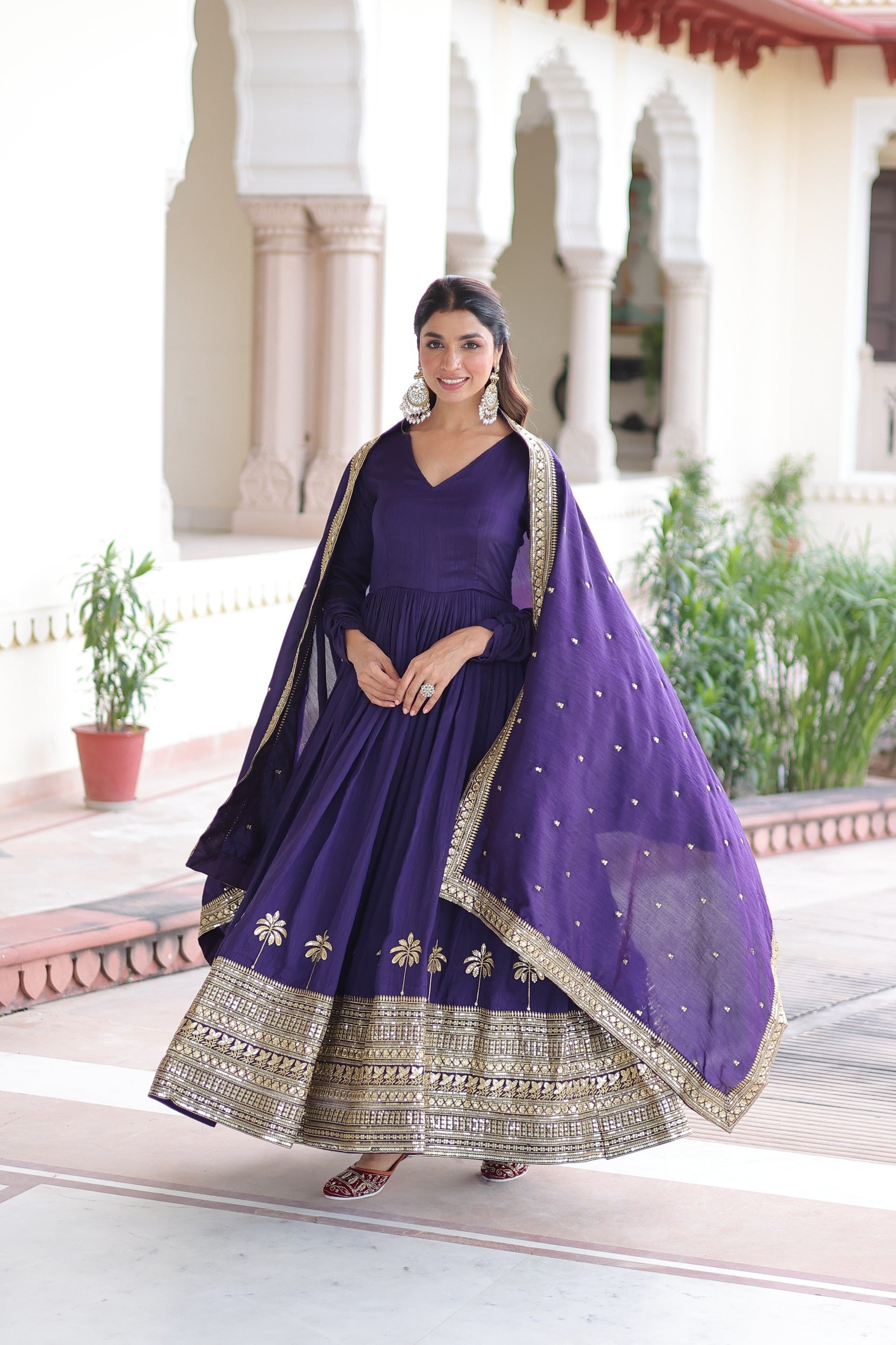 Add a touch of elegance to your ethnic collection with this beautifully crafted Vichitra Silk gown set, designed for women who love a blend of traditional charm and modern style. The gown features rich sequins embroidery work, giving it a luxurious festive appeal that makes it perfect for weddings, celebrations, and special occasions.